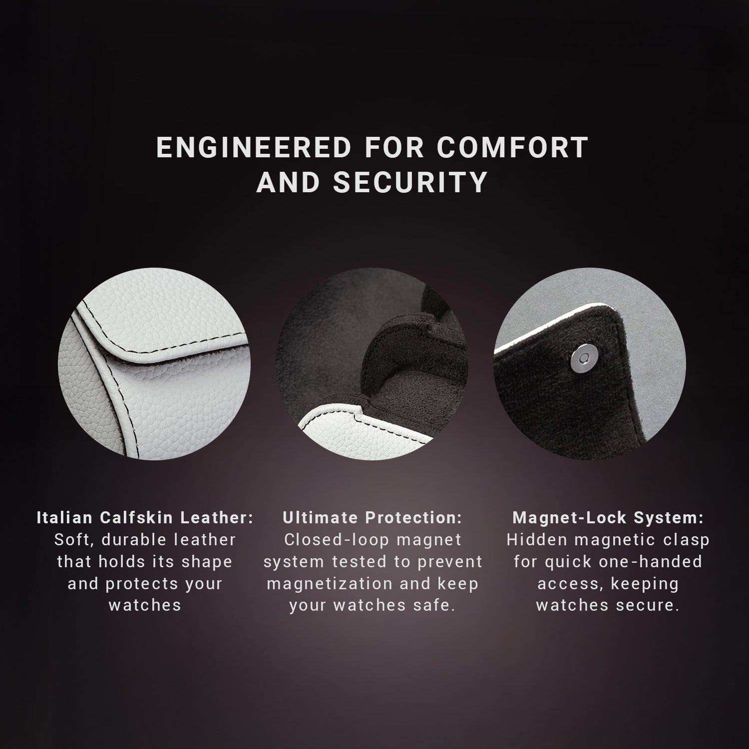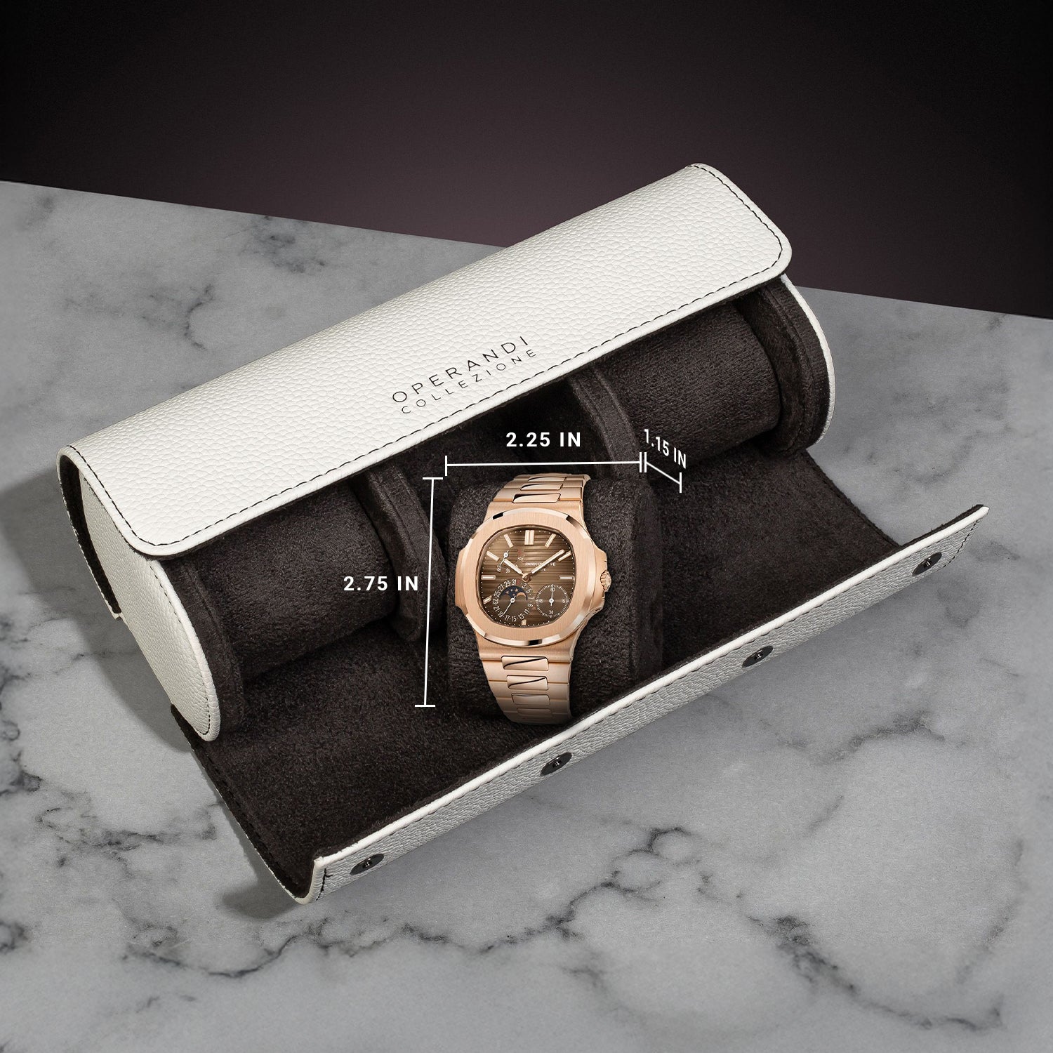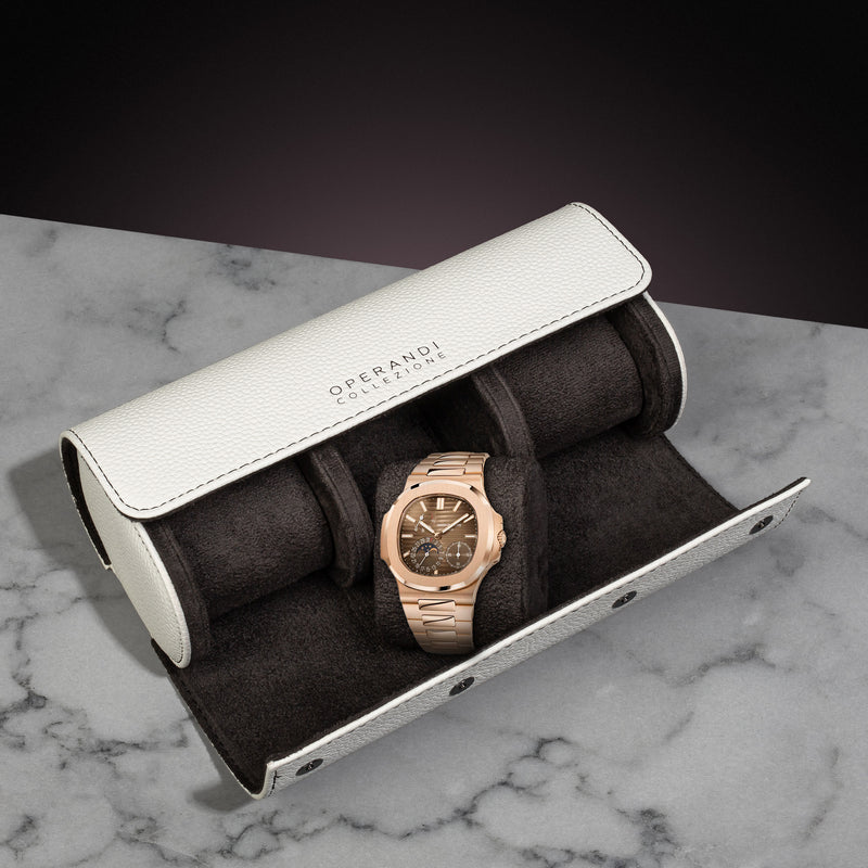 Masterfully crafted from premium Italian calfskin sourced from Florence, each piece is meticulously hand-assembled by skilled artisans, ensuring precision and attention to detail. The Pearl White —gives this watch roll a classic and shinny look, while the plush dark black terry cloth interior provides a soft, protective resting place for your timepieces.