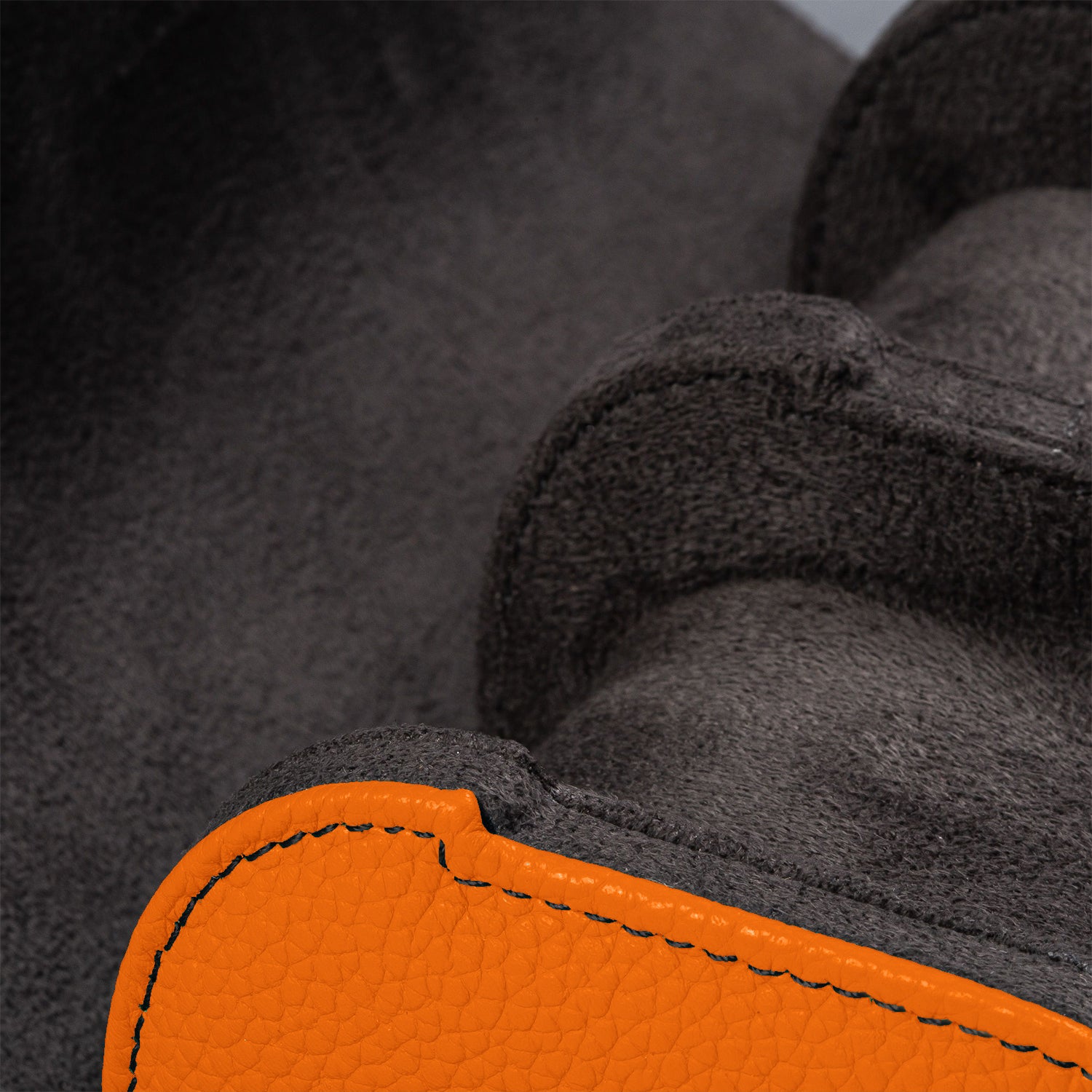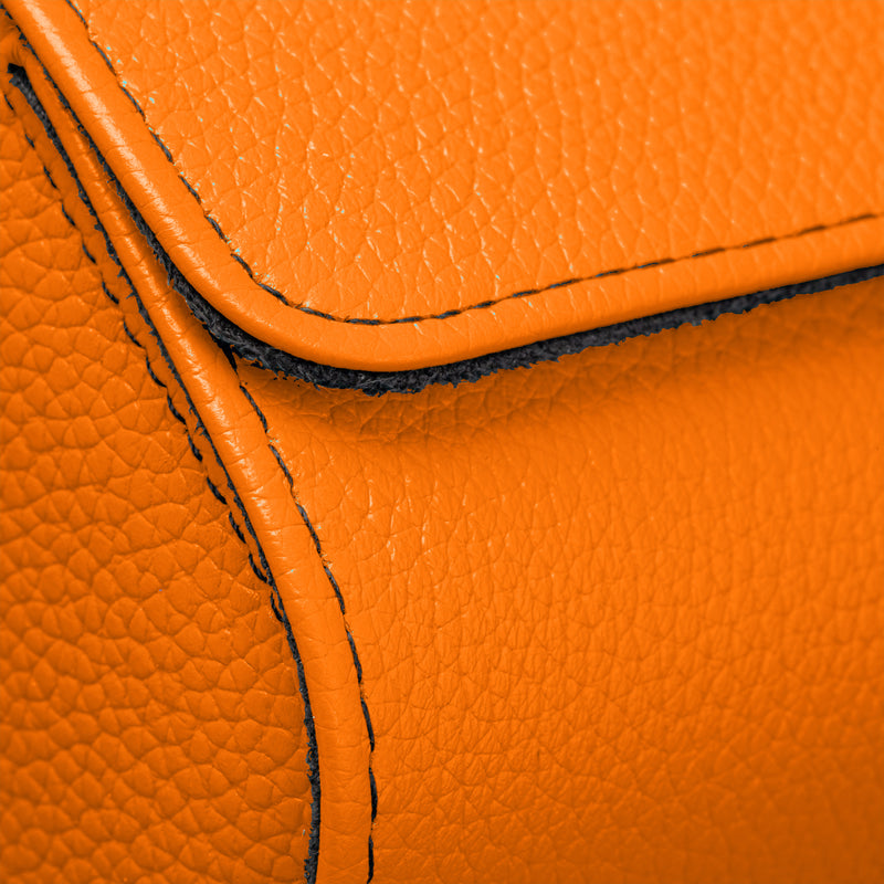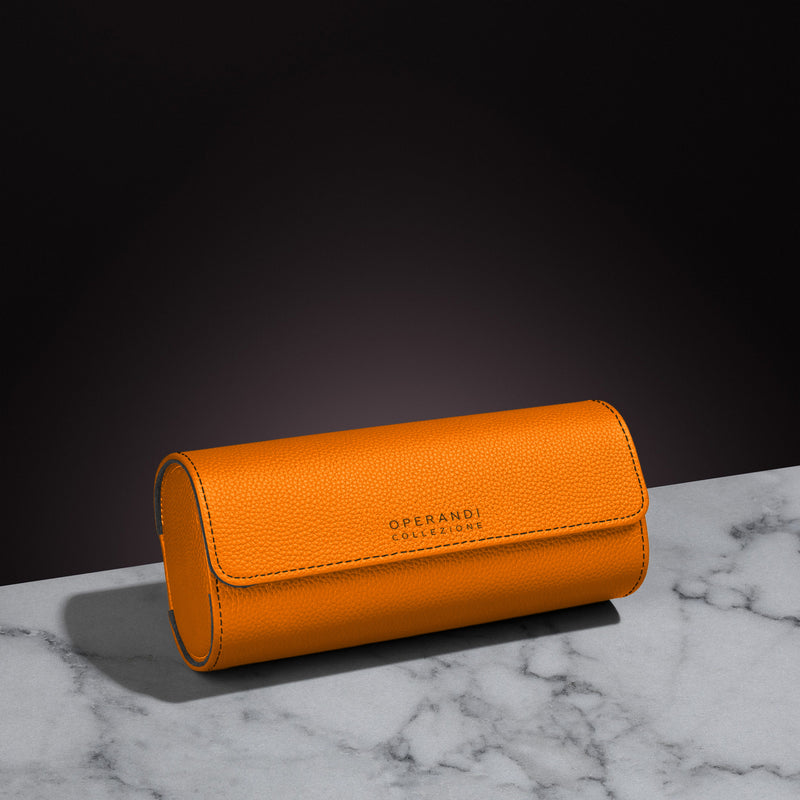 Masterfully crafted from premium Italian calfskin sourced from Florence, each piece is meticulously hand-assembled by skilled artisans, ensuring precision and attention to detail. The MSO PAPAYA shade—an electrifying, high-gloss orange —gives this watch roll an exotic and dynamic appeal, while the plush dark terry cloth interior provides a soft, protective resting place for your timepieces.