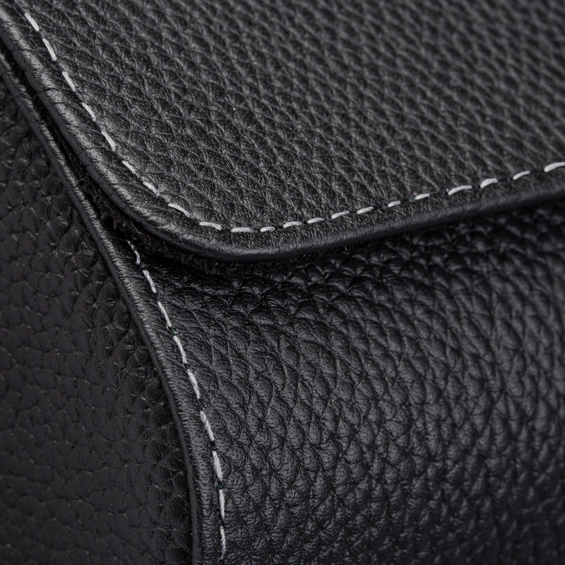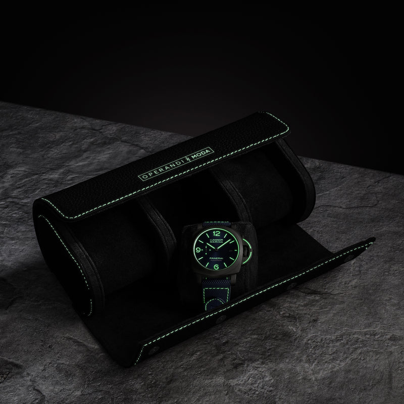 Masterfully crafted from premium Italian calfskin, the all-black exterior is paired with a deep, dark grigio terry cloth interior, providing a soft, protective resting place for your most prized timepieces. Subtle green stitching and logo details are visible in daylight as refined nods to the MODA aesthetic, while in darkness, the roll transforms with a vivid green glow-in-the-dark effect, creating a signature luminescent presence that is entirely unique.