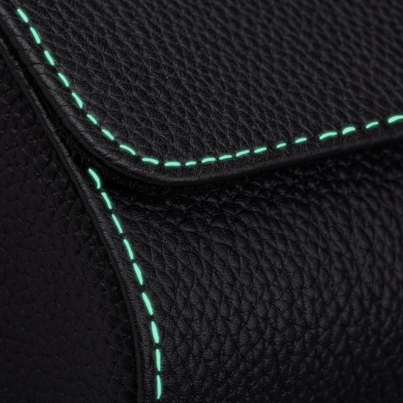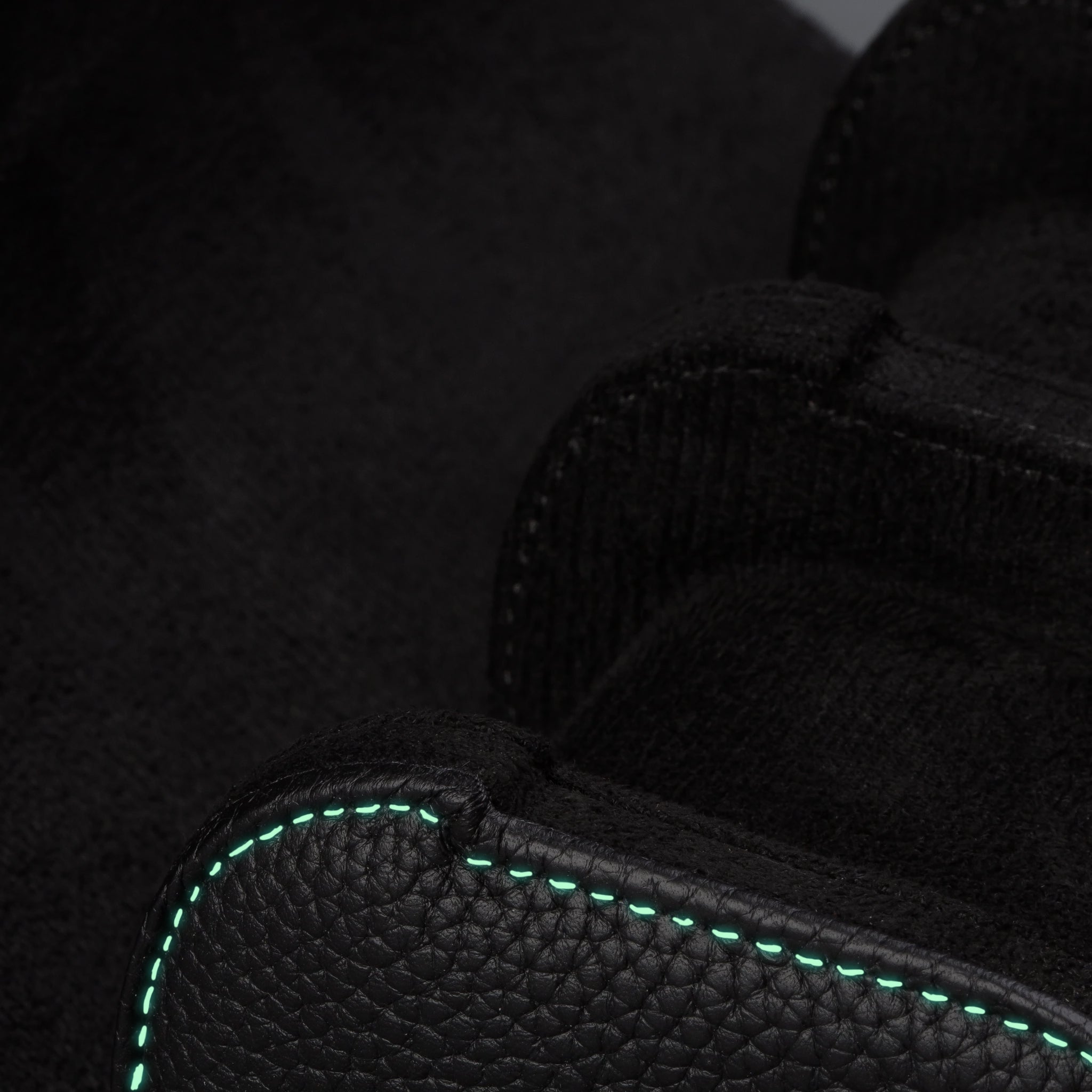 Subtle green luminous stitching and logo, visible under light as a refined hint of signature design.
