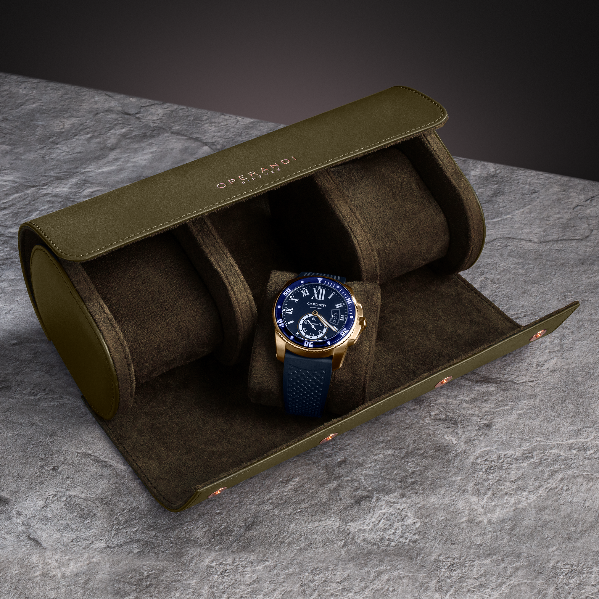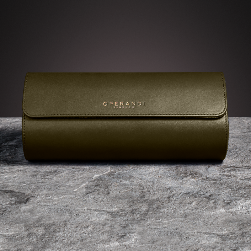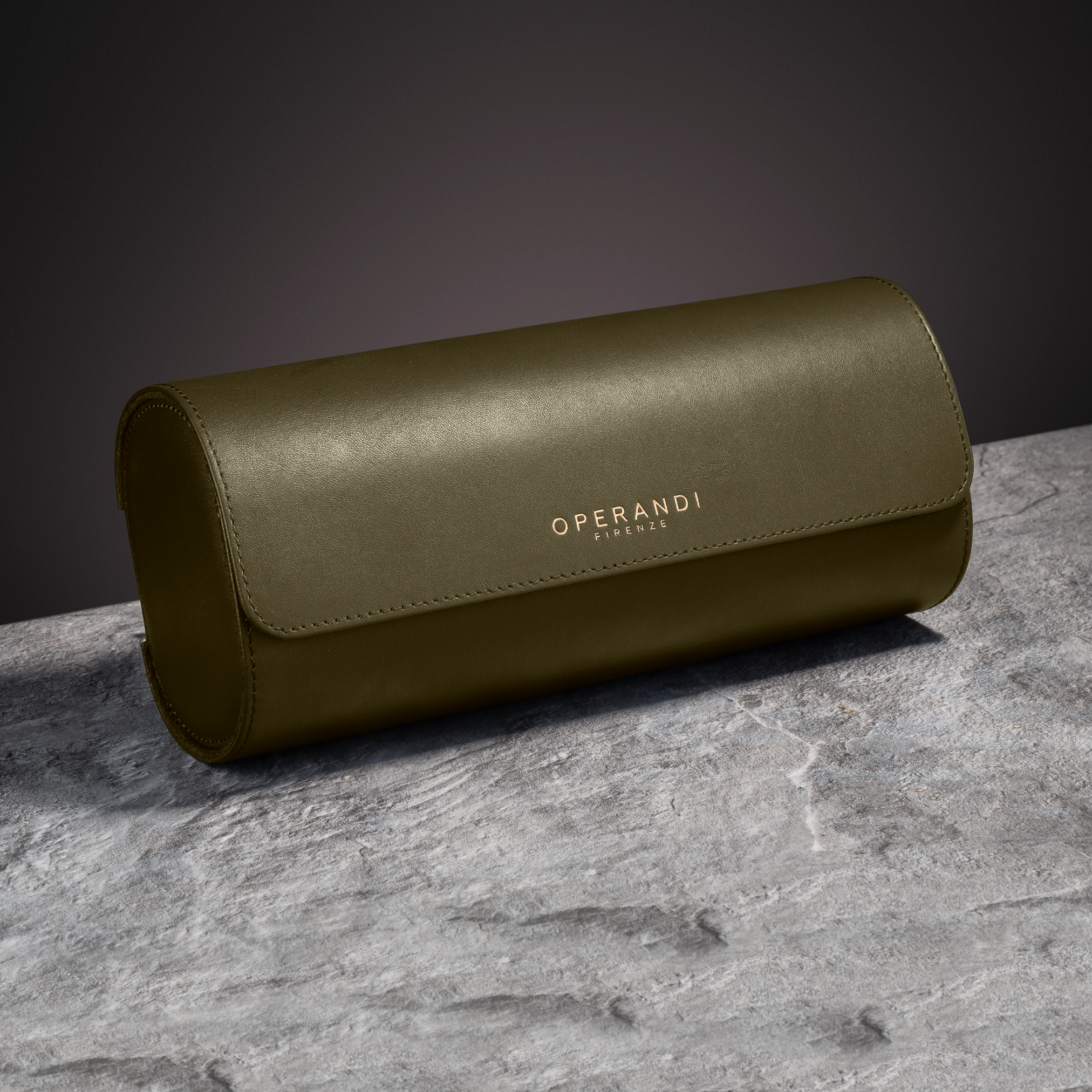 Experience the epitome of luxury with the Operandi Verde Oliva Multi-Compartment Watch Roll, masterfully created from premium Italian calfskin sourced from Florence—the heart of world-renowned leather craftsmanship. This exquisitely crafted watch roll blends artisanal elegance with contemporary design, ensuring your watches are carried in style and protected with unmatched precision.